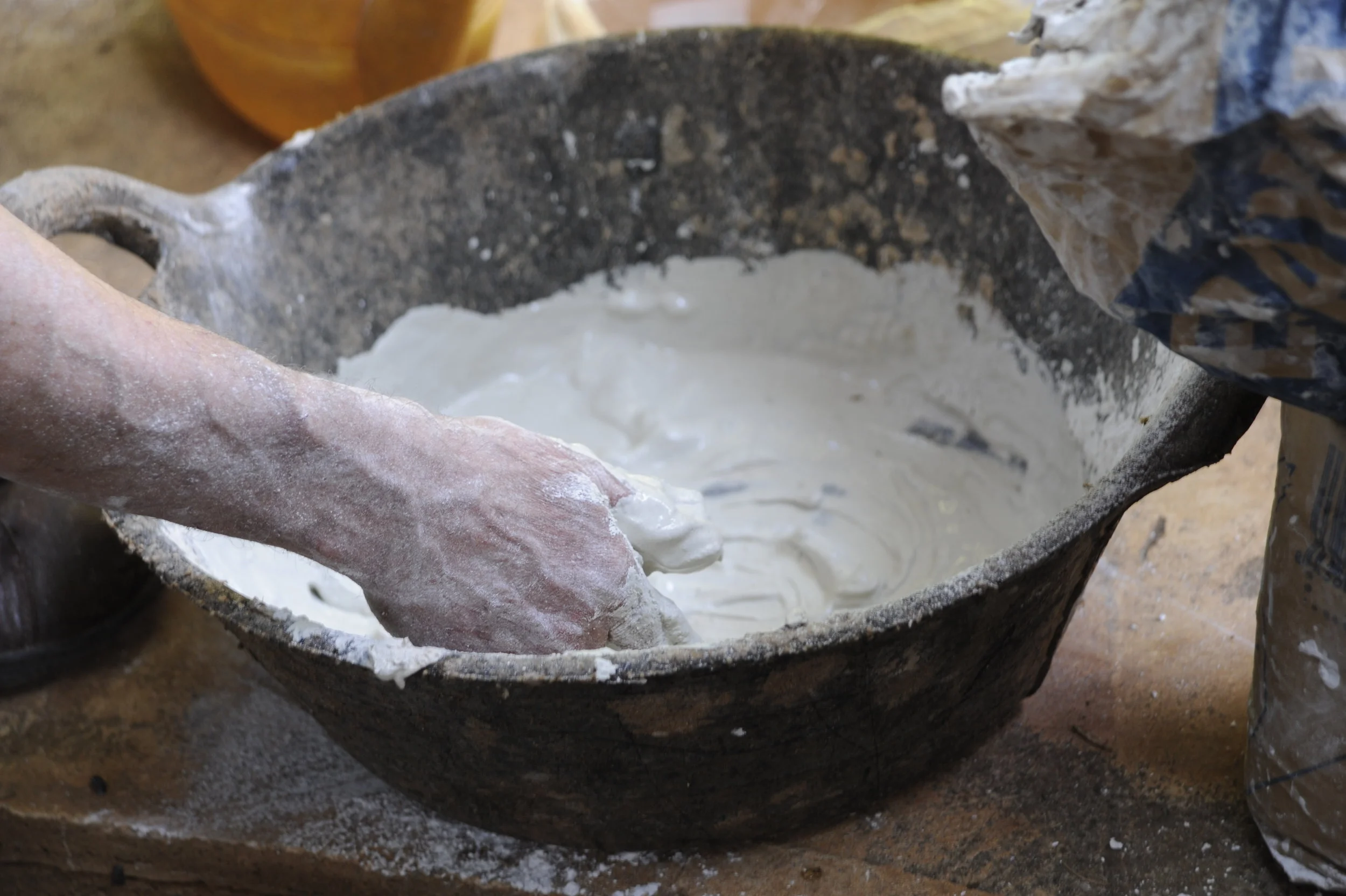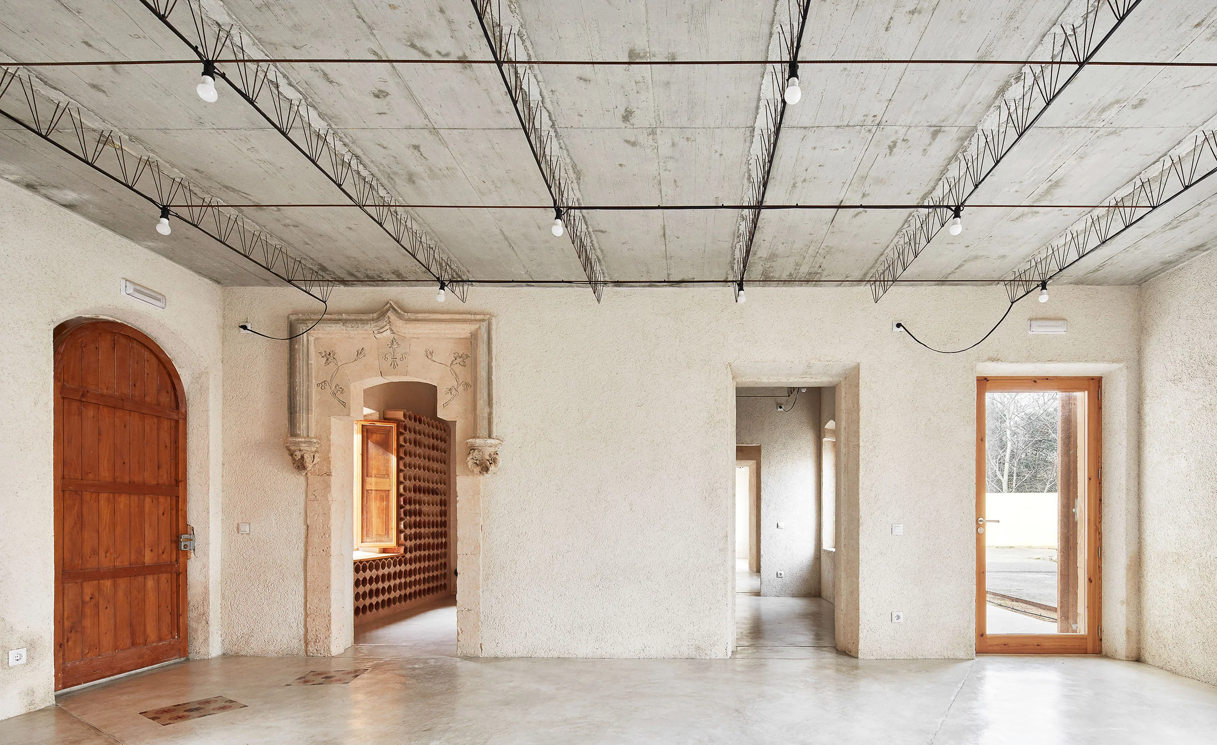 2-The used materials accompany the pre-existences in order to reinforce their presence in the project. For instance, the concrete slab for the first floor and the wooden roof are supported by the masonry walls. The lime mortar made in the same town (Felanitx) covers in its entire vertical faces, even the interior doors and windows' thresholds. The ceramic thermal blocks and the bottle racks (used by wineries) construct the new vertical elements, such as the bathroom and the elevator boxes, as well as a bottle rack piece of furniture attached to a window.
