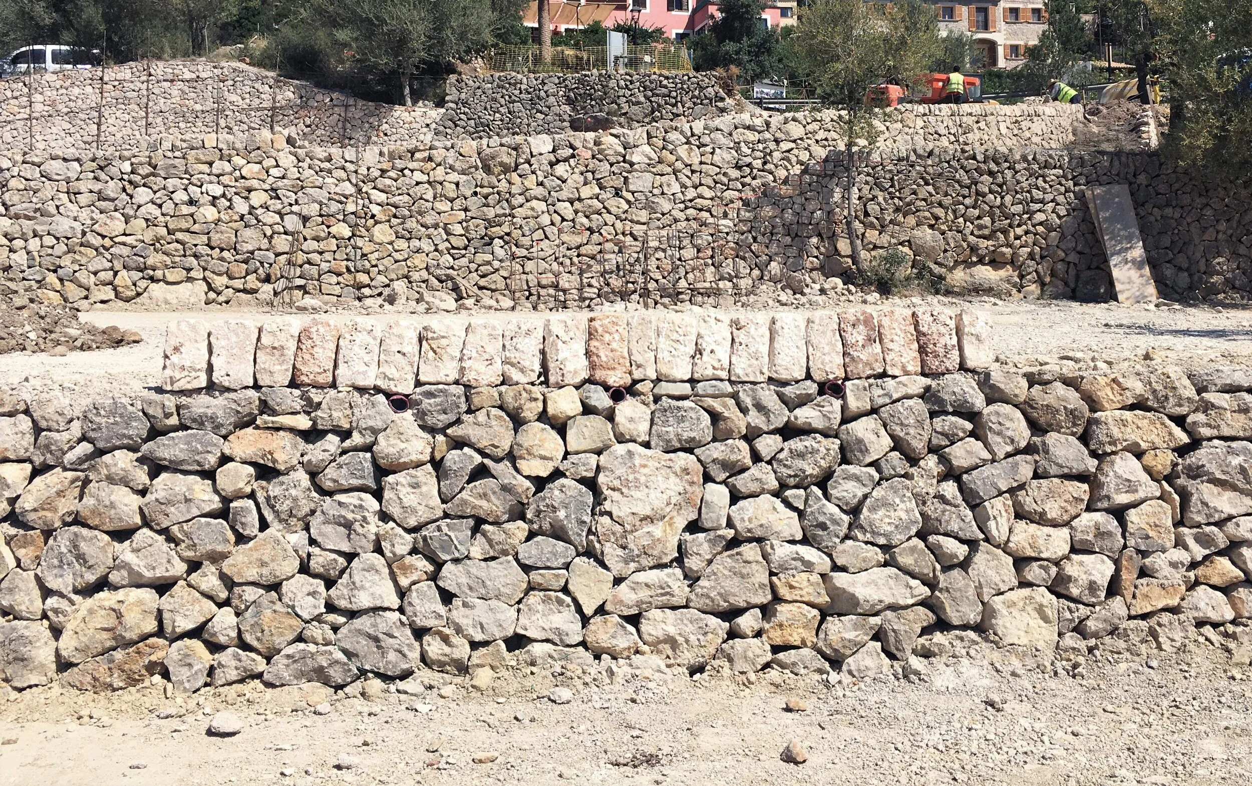 the construction of gravity retaining walls, using the pedra en sec technique, has proven to be more economical and has allowed us to continue recovering the trade. Once we have the walls, instead of placing soil for crops, we place compacted soil for the circulation of vehicles, the parking area and rest areas for neighbors and visitors.