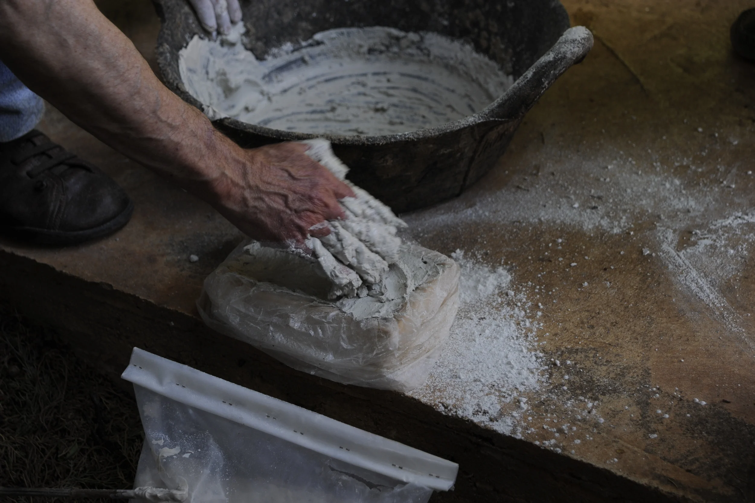 The house sinks into the bench terracing to adapt to the topography and the existing fabric of structures. An old pathway used by peasants to reach the mountain has become the landing, entrance and veranda of the house. The first volume we meet contains the common areas. A few steps lead up to the bench terrace on the right, where there is a smaller volume housing the more private quarters. The difficulty during construction was the seventy-two steps up the sole path to entry. A forklift truck operated by a single man brought up the thermal clay blocks, and a helicopter flew in the concrete.