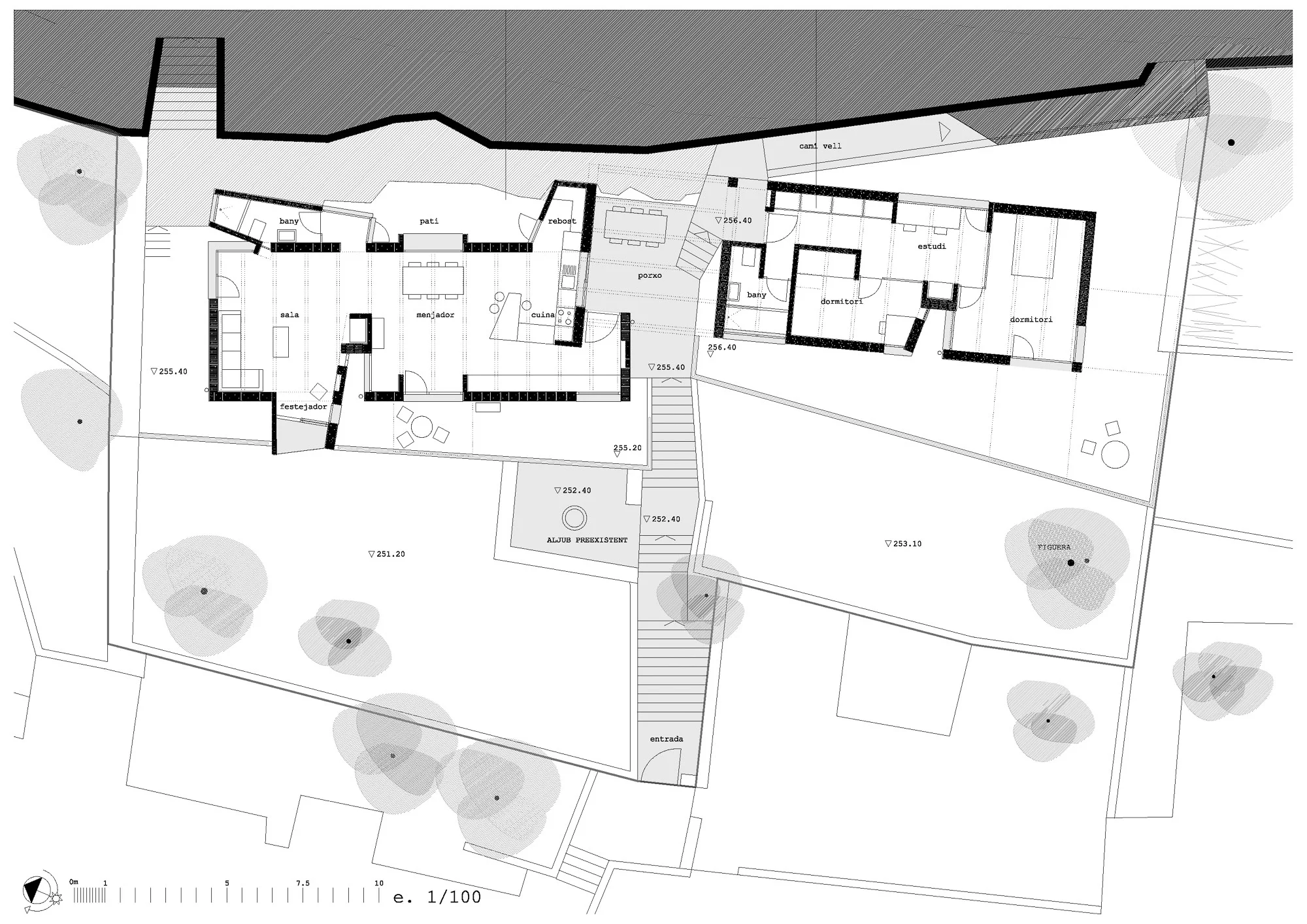 Finding oneself in a place where a pre-existing structure provides the only access makes the architect an apprentice again. The fact that a man on foot or a donkey are the only ones to ever pass through has never been a drawback. This construction heeded simplicity, both in choice of materials (those found in the surroundings) and in its adaptation to the topography. It should be understood that this is not a contemplated landscape, silent like a painting on the other side of the woodwork of the windows, but rather that intervening in it is building for an entire community of houses accustomed to sharing bench terraces, walls, patios, staircases, flat roofs…