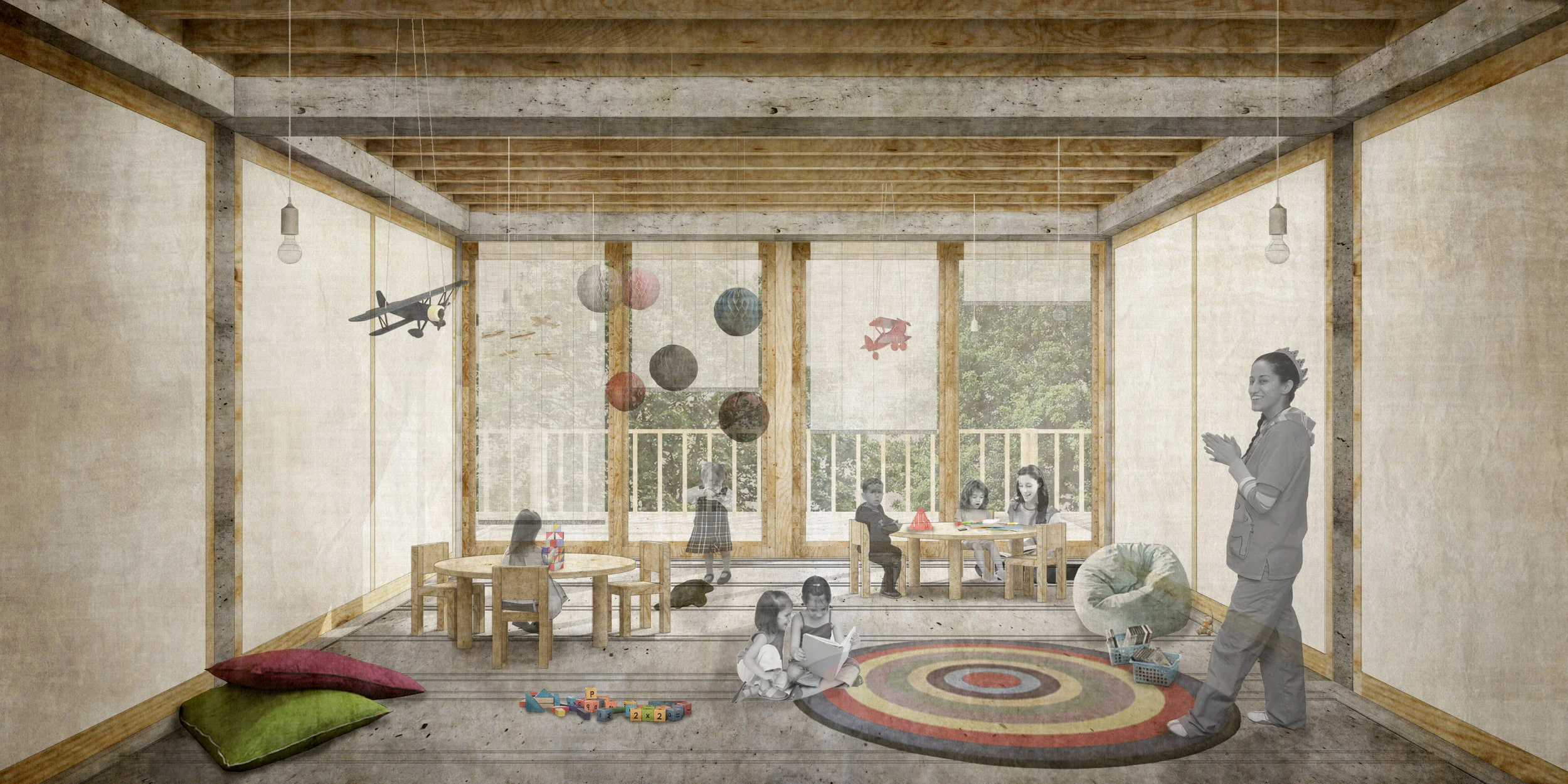 The project aims to achieve maximum comfort in both interior and exterior spaces through modular and functional architecture, as well as the integration of selected vegetation to create a natural landscape. Three strategies have been employed: terracing the terrain to create platforms, organizing exterior spaces with a base that houses common uses, and placing three volumes that confine exterior spaces. The connection between uses is facilitated through a base that links the complex's programs, and three volumes emerge to accommodate the school, residence, and external consultations. Complete transparency of interiors towards the exterior is chosen to enhance the quality of life for residents and teaching activities.